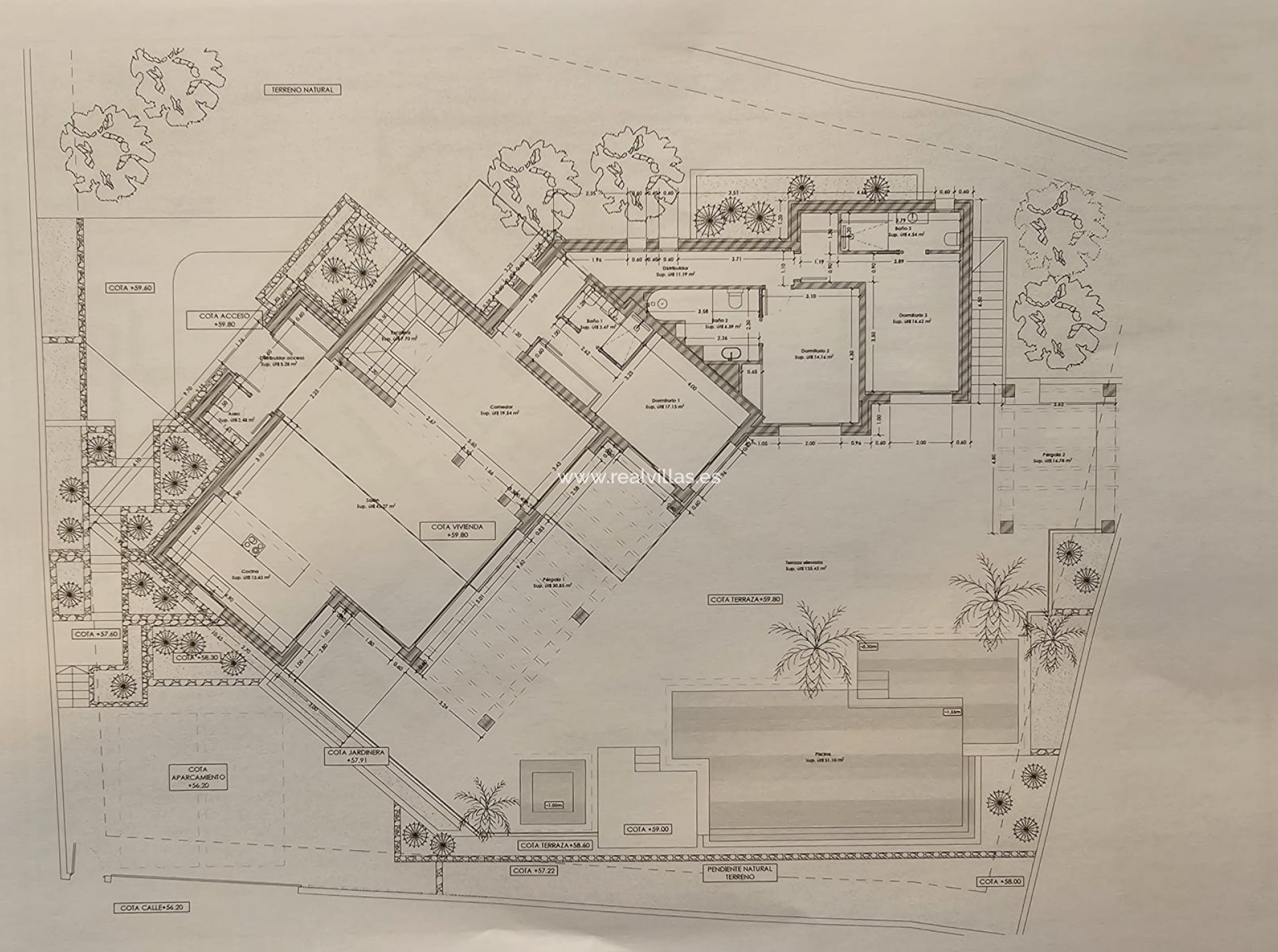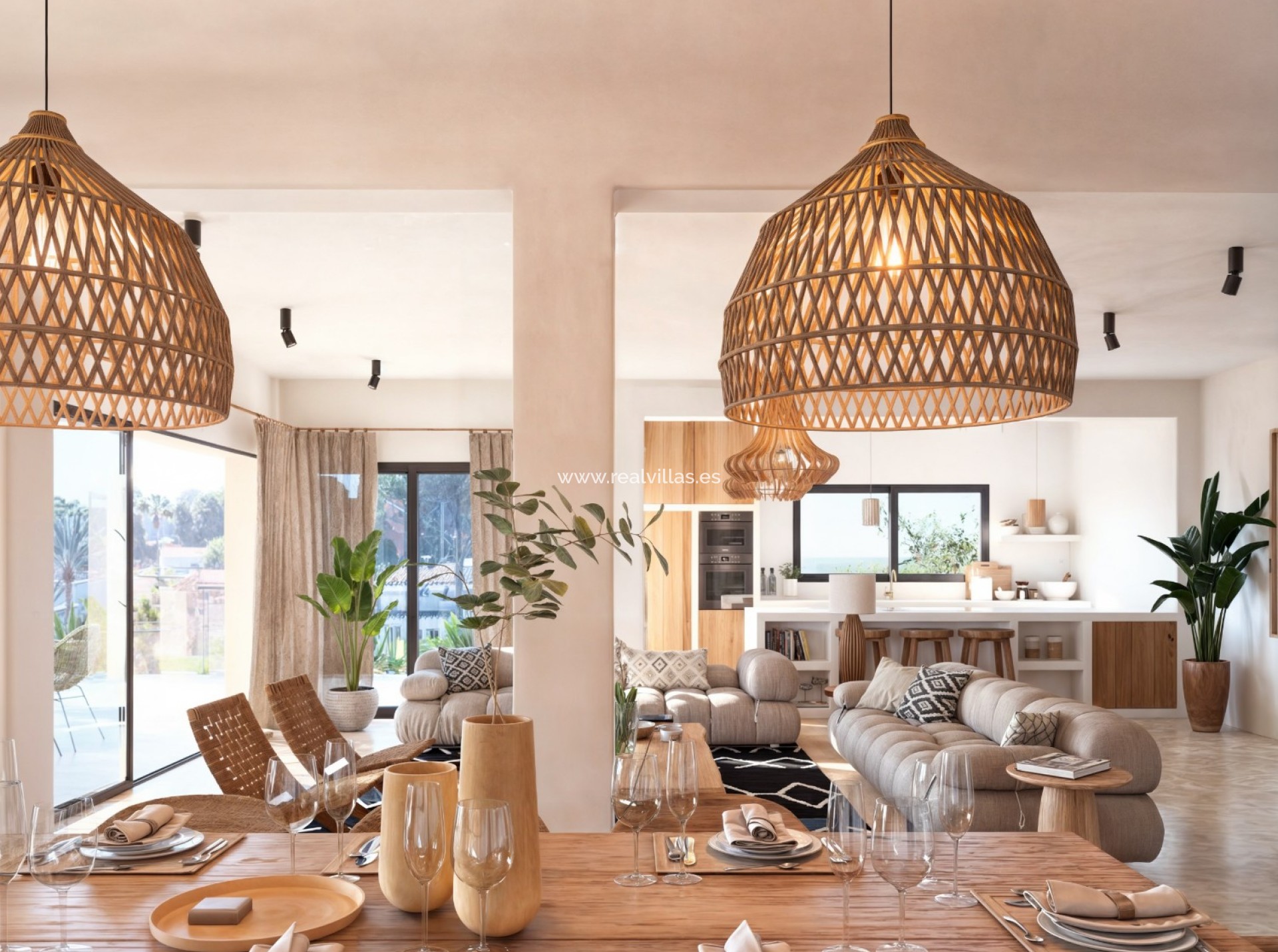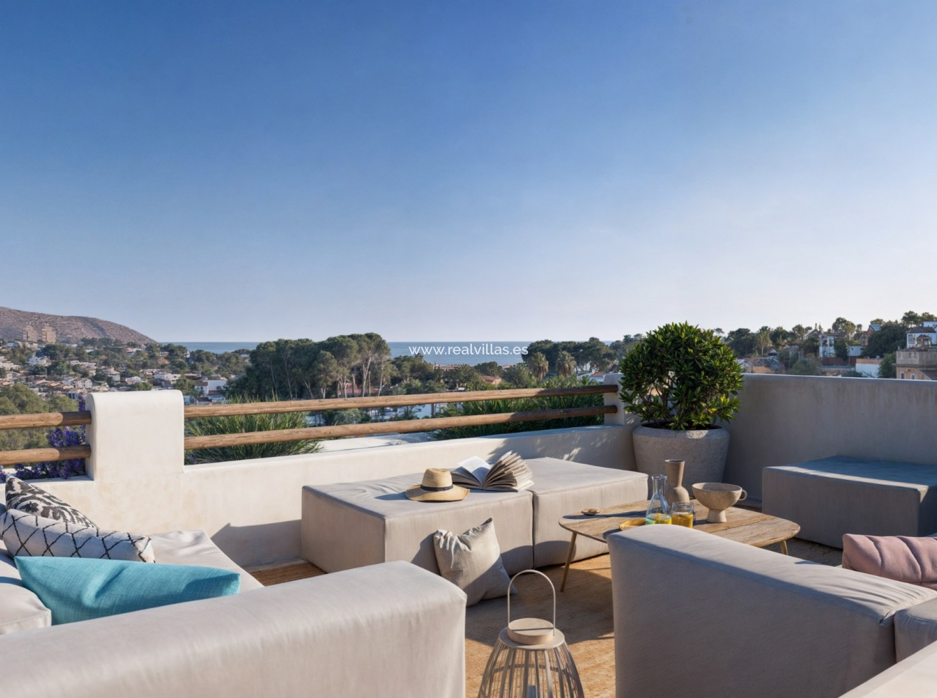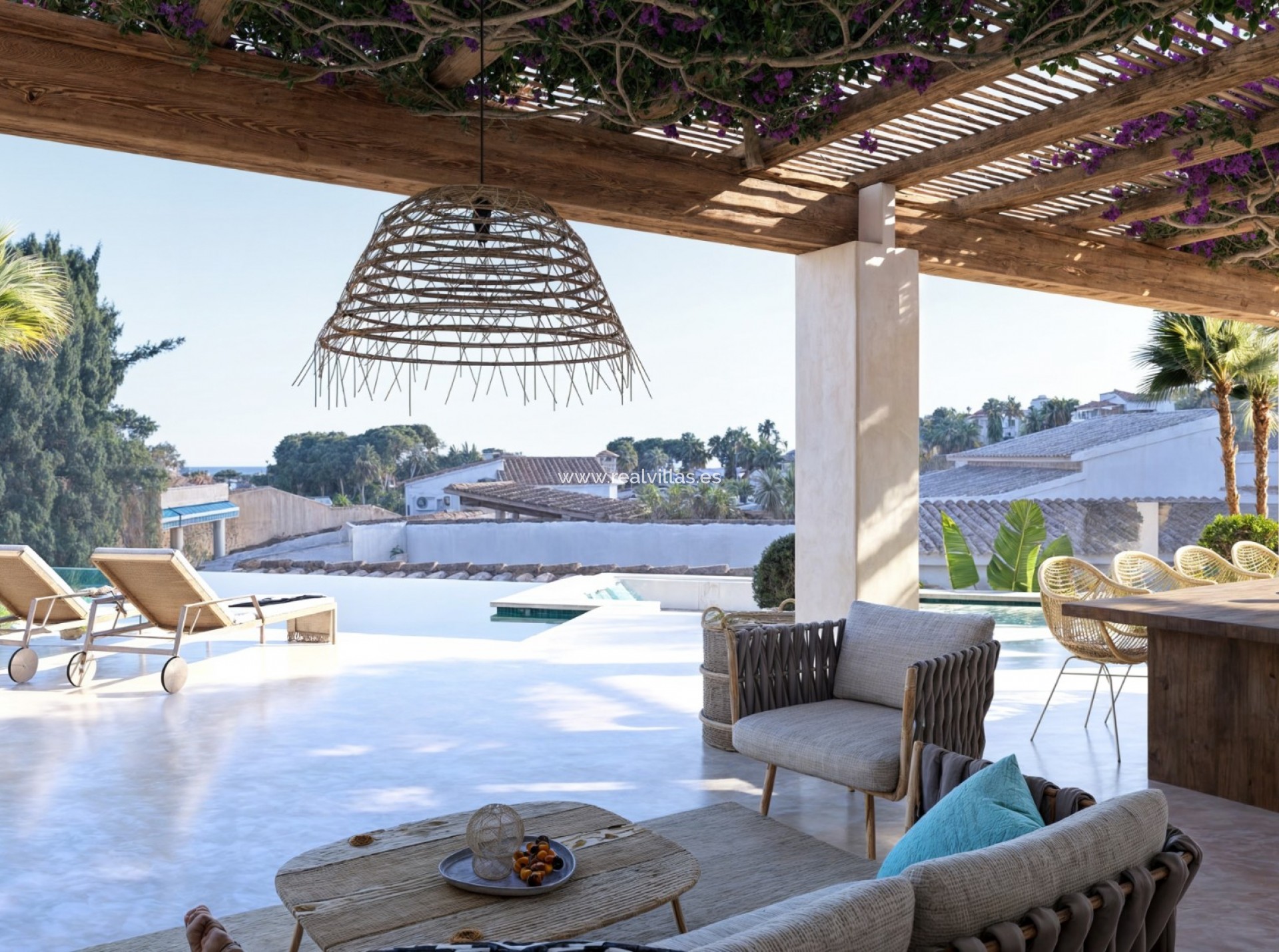 The outdoor spaces, framed by designer planters with carefully selected Mediterranean vegetation, are complemented by three strategically located pergolas that define different environments for rest and well-being, providing comfort and reinforcing the exclusive character of the villa.